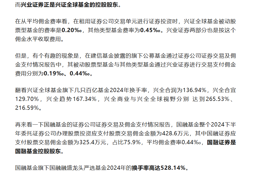 记得在今年4月份,研究员曾经写过一篇《公募基金交易分佣晒明细:券商对“亲儿子”收费不手软,小公募“给爹打工”换手率超500%》提到,在2024年,有些基金给到自己的券商“爸爸”的佣金费率特别高,还提到个别中小基金换手率居高不下,为券商“爸爸”贡献了不少佣金收入。